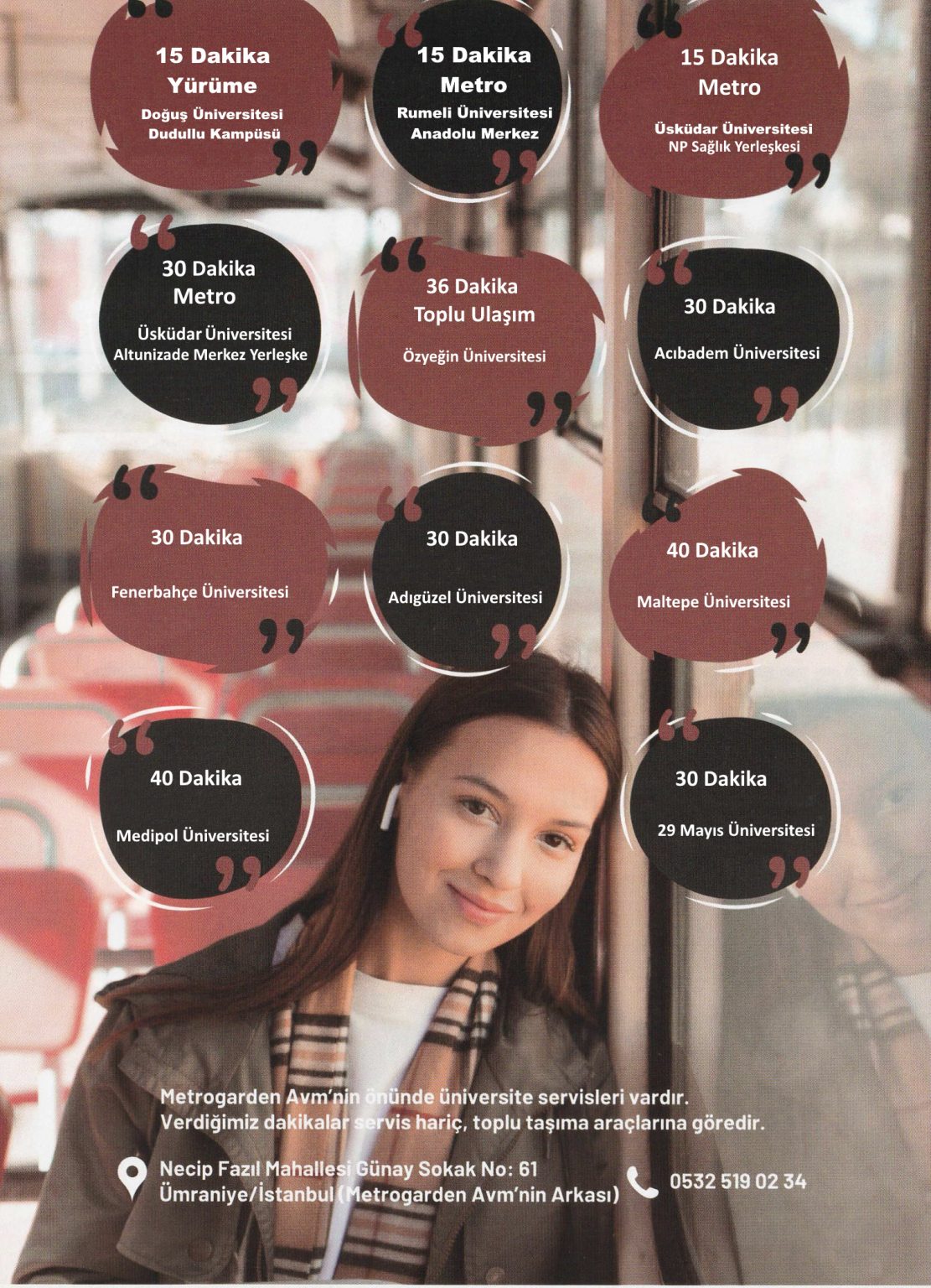 Doğuş Üniversitesi Dudullu Kampüsüne En Yakın Yurt Biziz. Kampüsüne sadece 15-20dk bir yürüme mesafesindeyiz, ayrıca metro ve belediye otobüsü ile de 15 dakika ulaşım imkanı.